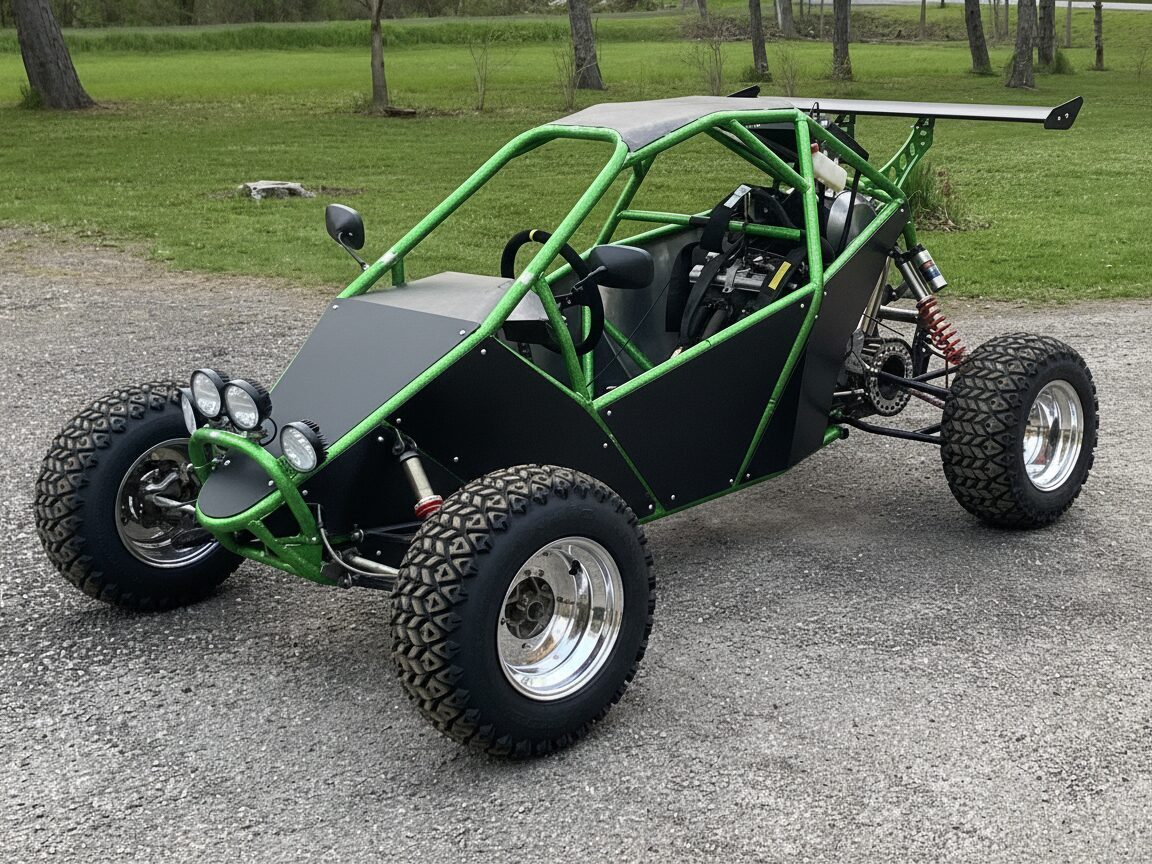 The VF-1 Crosskart is a popular single-seat, homebuilt off-road buggy designed by KJ Raycing for DIY enthusiasts. It’s built around a tubular steel frame with full independent suspension delivering a smooth, ride over rough terrain, trails, jumps, —far beyond what a basic go-kart offers.